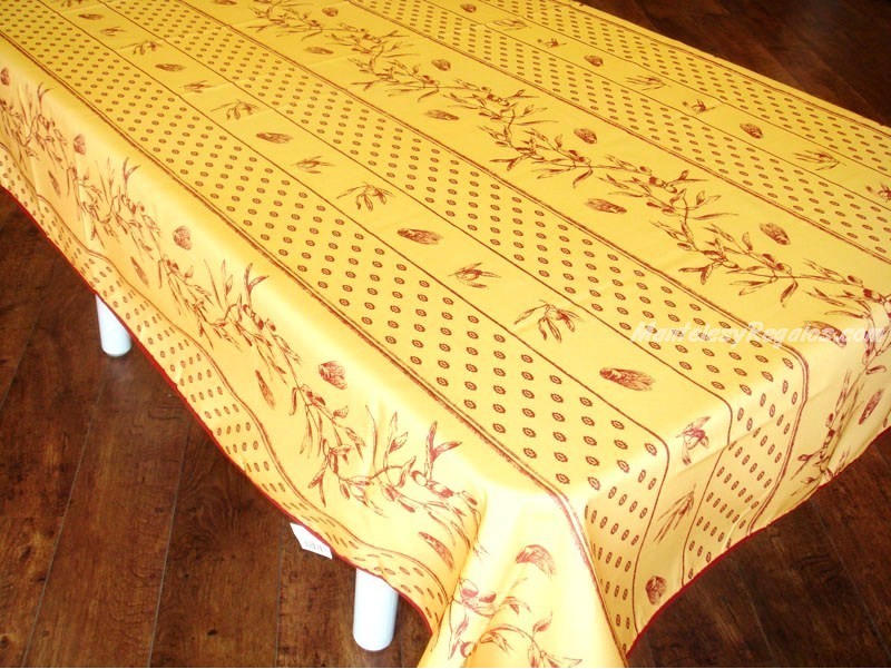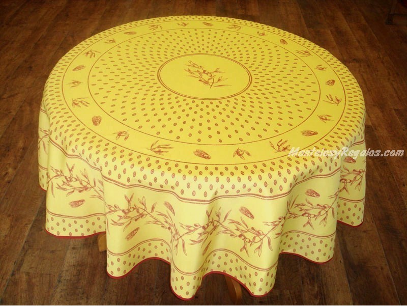 Exclusivo Mantel de Poliéster Antimanchas y Antiarrugas. Tejido 100 % en poliéster modelo Cigarras y Olivas Amarillo. Acabado con biés. Múltiples medidas para elegir.