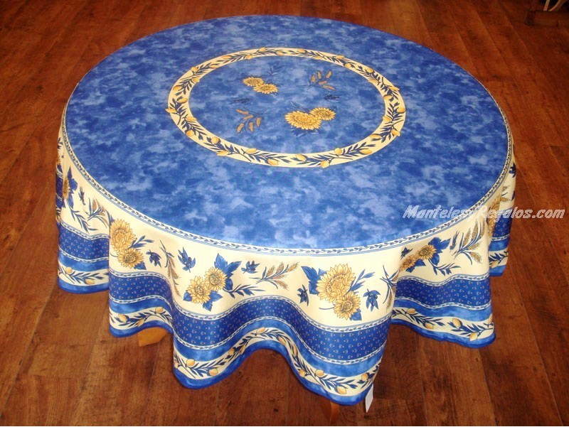 Exclusivo Mantel de Poliéster Antimanchas y Antiarrugas. Tejido 100 % en poliéster modelo Girasol Abeja Azul. Acabado con biés y con una capa antimanchas en la parte superior.
