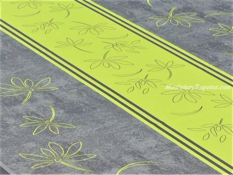 Bonito Mantel de mesa modelo Lotus en colores verde, gris y negro.