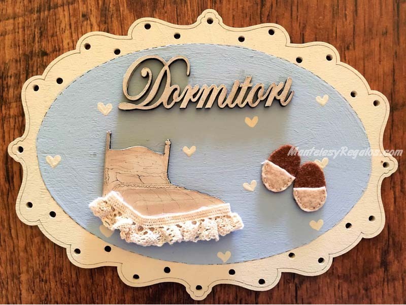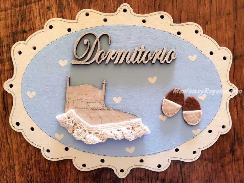 Placa de puerta para el dormitorio sobre fondo azul con texto y accesorios de madera cortados con láser (20 cm. ancho). Tiene forma ovalada y está pintada a mano (con 2 textos diferentes para elegir).
