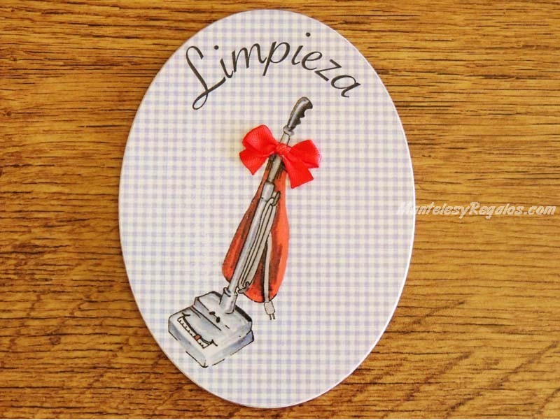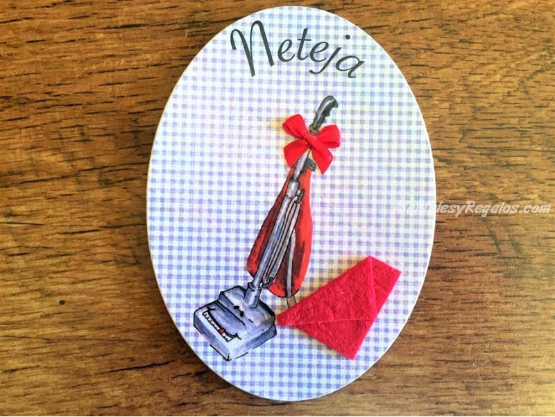 Placa para puerta del cuarto de limpieza con el dibujo de una aspiradora (15 x 11 cm). Es de madera, tiene forma ovalada y tiene un aplique (lazo) encima de la aspiradora. Puedes elegir entre 2 opciones de texto.