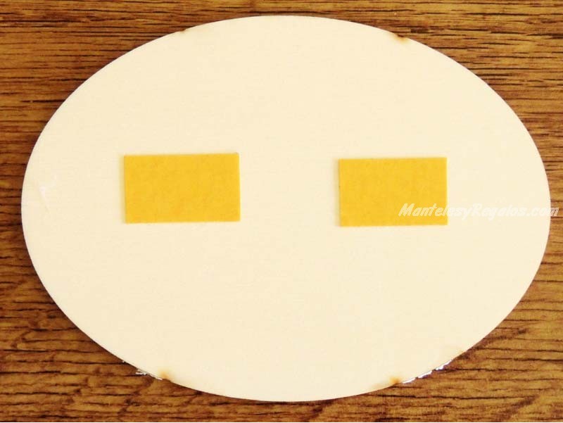 Es de madera, tiene forma ovalada y lleva un aplique (lazo) encima del dibujo principal.