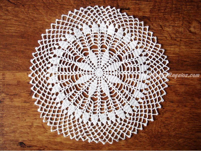 Bonito Tapete bordado con forma redonda en color blanco (27 cm. de diámetro). Es ideal para decorar en el centro de una mesa de madera oscura o encima de una cómoda.
